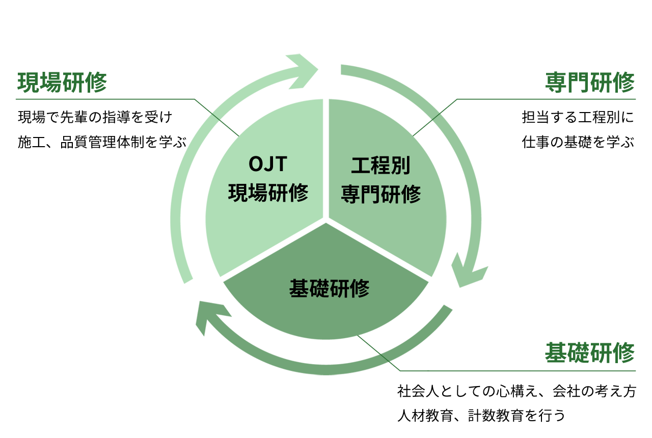 1物件は3ヶ月ほどの工期です。半年~2年ほどで独り立ちしていただくことを期待して、段取り力ある人財育成に取り組みます。